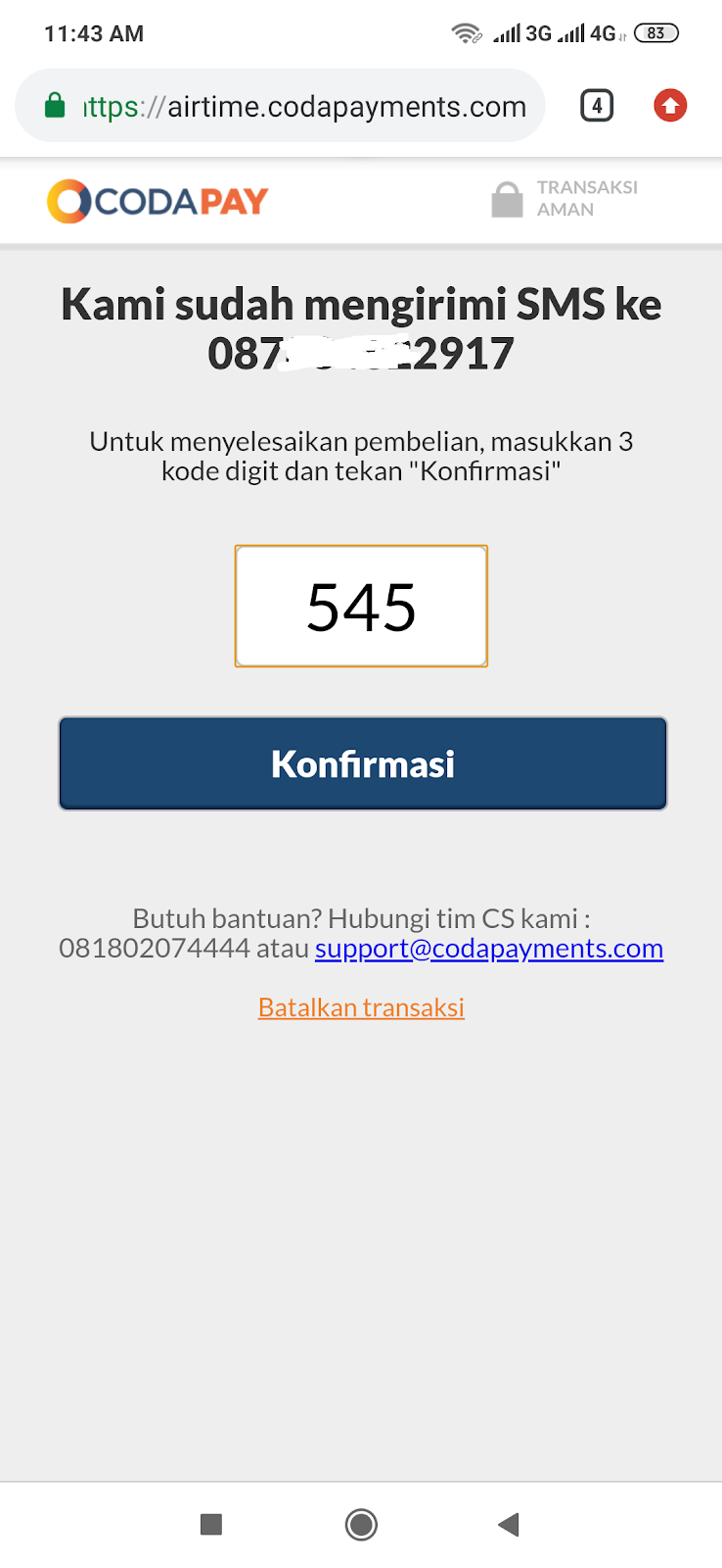 • Step berikutnya kalian masukan kode konfirmasi 3 digit yang dikirim ke nomor hp kamu tadi jadi secara otomatis nanti pulsa kamu akan terpotong. Silahkan cek sms masuk dari Codapay lalu masukan dan klik konfirmasi guys.