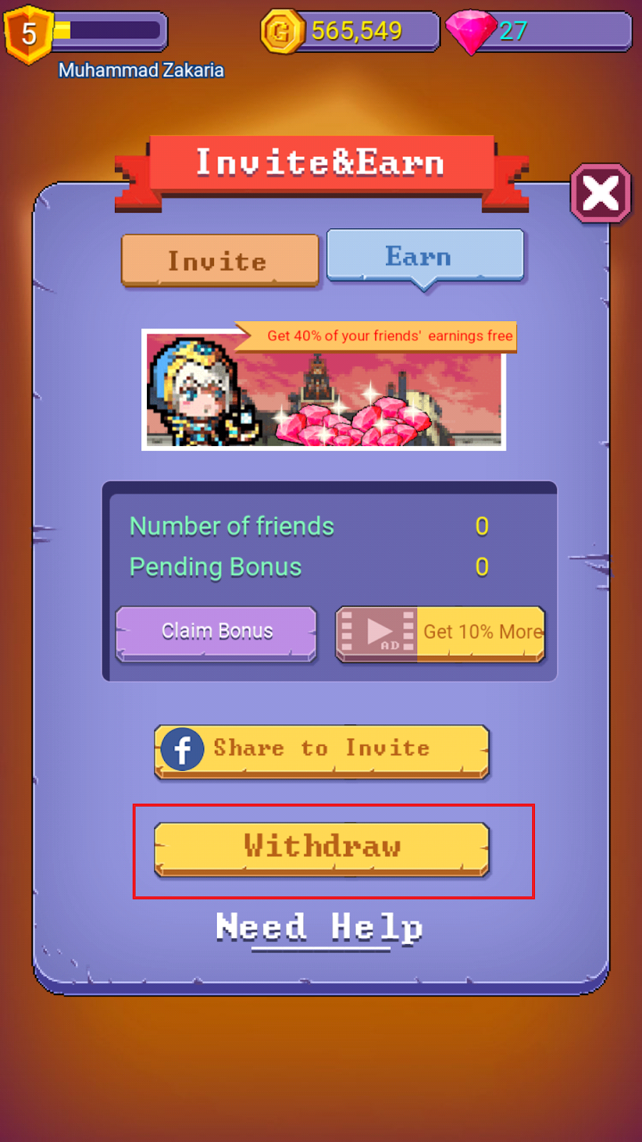 - Inilah hasilnya naik juga level game menjadi level 5 selanjutnya Tap to close. Untuk dapat membuka gambar dollar nya seperti pada gambar dibawah. Selanjutnya kalian siapkan kode refferal nya untuk mendapatkan diamonds gratis yang akan ditukar dengan dollar paypal.