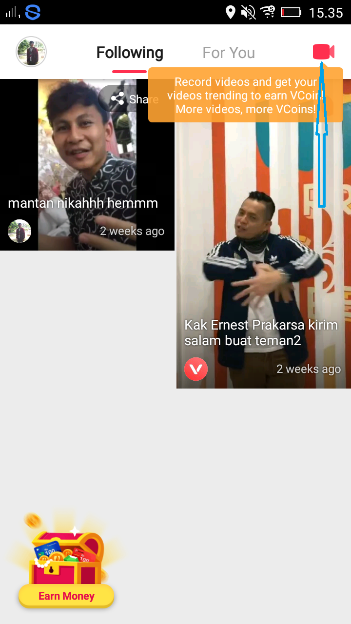 - Step berikutnya kamu lakukan perekaman dengan kamera depan atau kamera belakan untuk merubah kamera klik yang mimin sudah kasih warna merah. Lalu untuk memulai merekam tekan lingkaran warna merah yang telah mimin kasih warna biru. Tekan hingga durasi video di Aplikasi Vmate ini penuh lalu tinggal lepas gan jika sudah penuh.