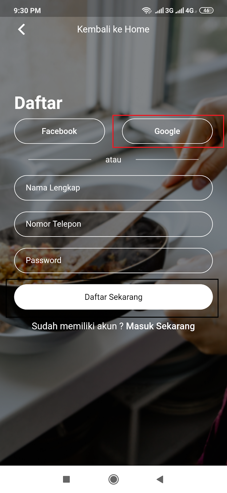 - Step berikutnya kamu tinggal melakukan pendaftaran dengan klik daftar dari facebook atau google maka akan otomatis ter isi untuk namanya. Atau kamu bisa mengisi nama lengkap, nomor telepon dan password kemudian klik daftar sekarang.