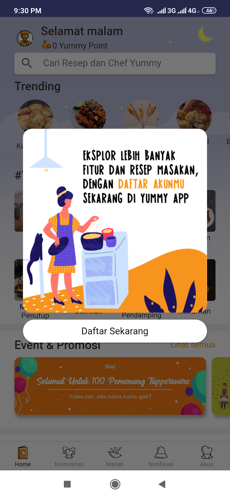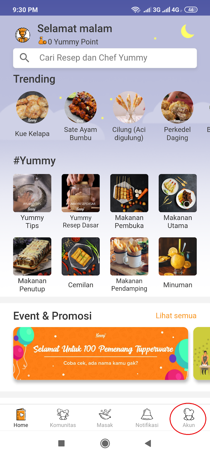 - Step berikutnya setelah masuk di Aplikasi Yummy Android kalian tinggal daftar akunnya caranya klik akun yang mimin tandai seperti pada gambar. Step berikutnya silahkan melakukan pendaftaran dengan akun google, facebook atau kamu bisa langsung daftar.