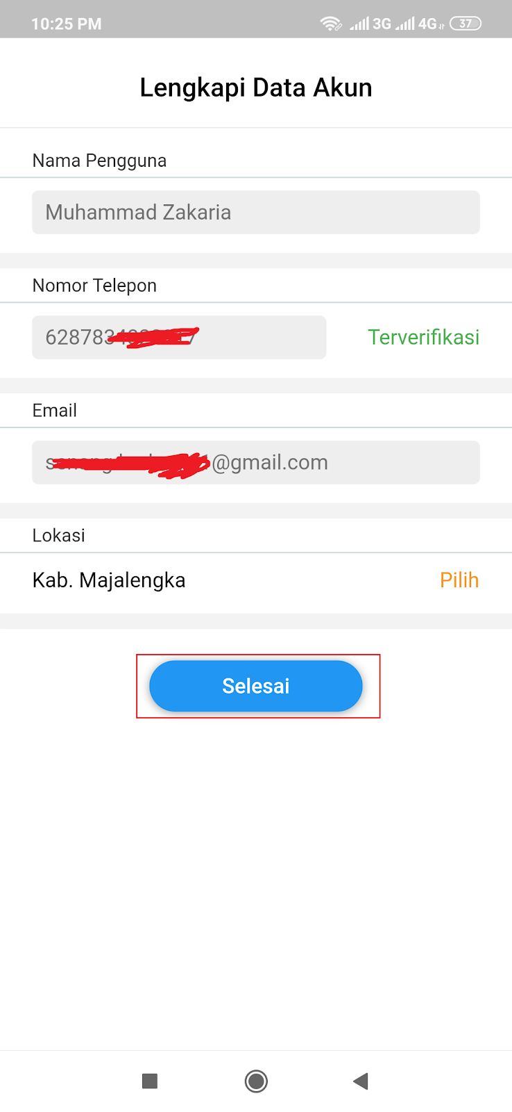 - Step selanjutnya pastikan data kamu lengkap silahkan lakukan verifikasi nomor hp juga, tambahkan email dan lokasi kota kamu. Jika sudah untuk mendapatkan 70 Point Yummy kamu harus memasukan kode undangan dari mimin klik “Punya Kode Referral?klik disini”. Untuk kode undangan silahkan masukan “muhammad-zakaria-1” kemudian klik selesai.
