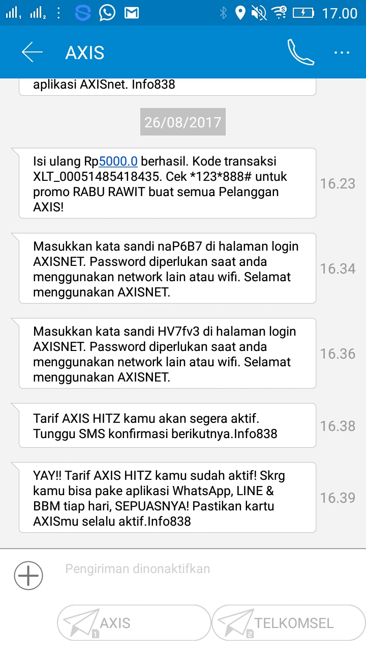 - Jika sudah anda bisa mengecek pulsa anda akan terpotong tinggal tunggu sms konfirmasi anda telah berhasil mengaktifkan Paket Axis Hitz. Ok diatas adalah bukti telah berhasil mengaktifkan Paket Axis Hitz yang sebelumnya kesulitan menggunakan dial di *123*7#. Jadi buat agan-agan bisa menggunakan cara mudah diatas ini.