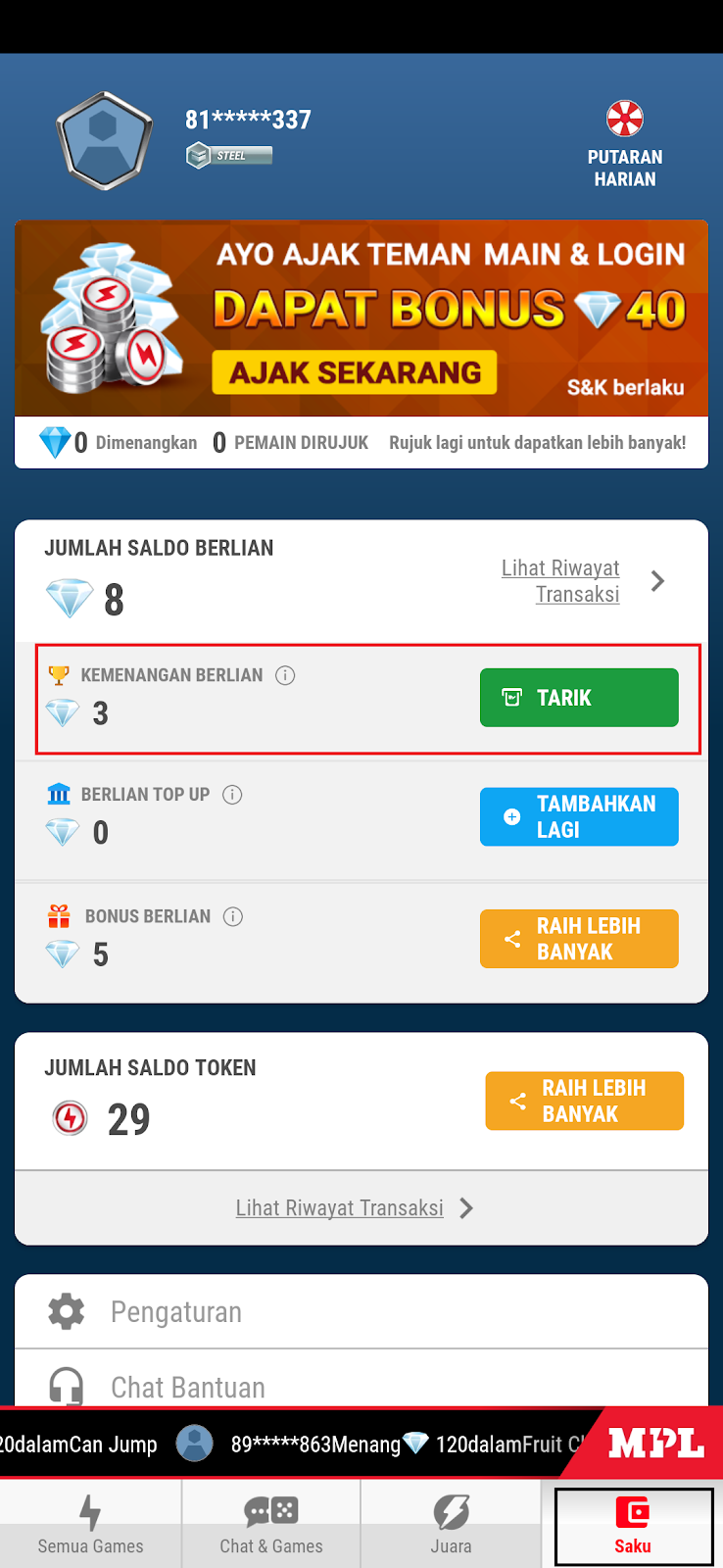 • Step pertama kamu masuk dimenu Saku pada Aplikasi MPL Android kamu, selanjutnya kalian klik Tarik pada berlian. Tentu untuk mendapatkan berlian ini temen-temen harus bermain game online nya pada aplikasi MPL tersebut.